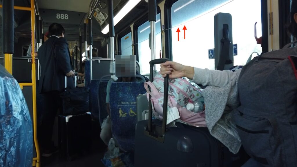 降車する時は窓側のワイヤー⬆︎⬆︎を引っ張って運転手に知らせます。カードタッチは不要です。