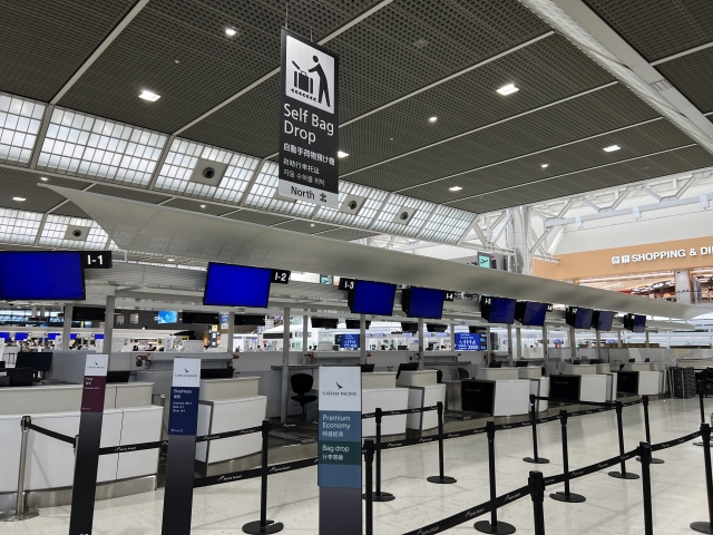 ここで**搭乗券(ボーディングパス)**を受け取り、大きい荷物(スーツケース)がある場合は預けます。